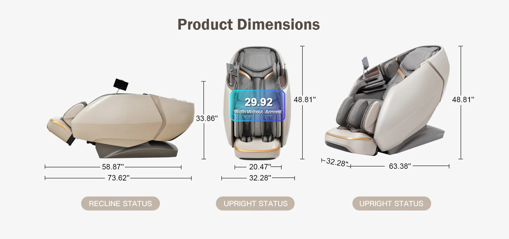 Product Dimension Reclined (in): 73.62(L) x 32.28(W) x 33.86(H)